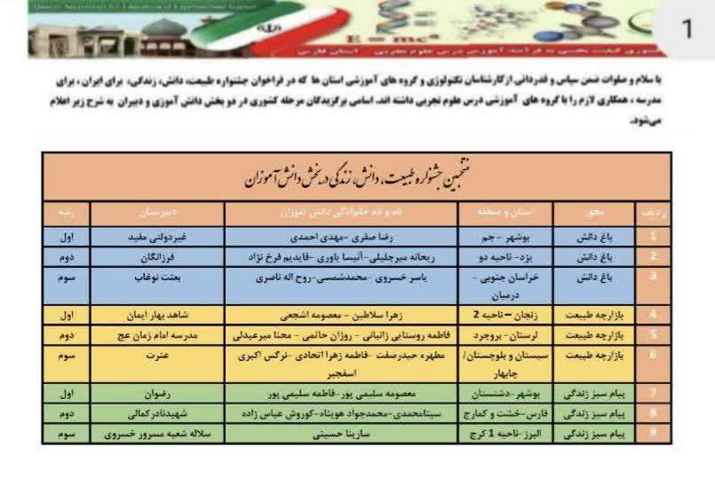 کسب مقام دوم کشوری در جشنواره طبیعت ،دانش ،زندگی در بخش دانش آموزی توسط دانش آموزان عزیز خانمها : ریحانه میرجلیلی آنیسا یاوری فایدیم فرخ نژاد از دبیرستان فرزانگان دوره اول